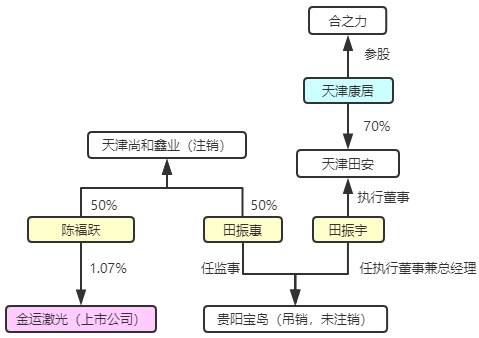 综上所述,陈福跃于2019年年中现身金运激光前十大股东。2019年8月29日,合之力成立,天津康居系发起人之一,天津康居与田振宇、田振惠有关联,而陈福跃与田振惠、田振宇曾合伙成立过公司,关系密切。下图呈现了陈福跃与合之力间接关联关系的追踪。