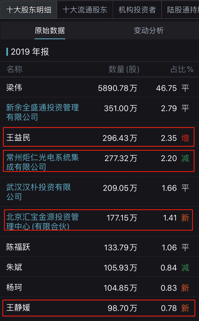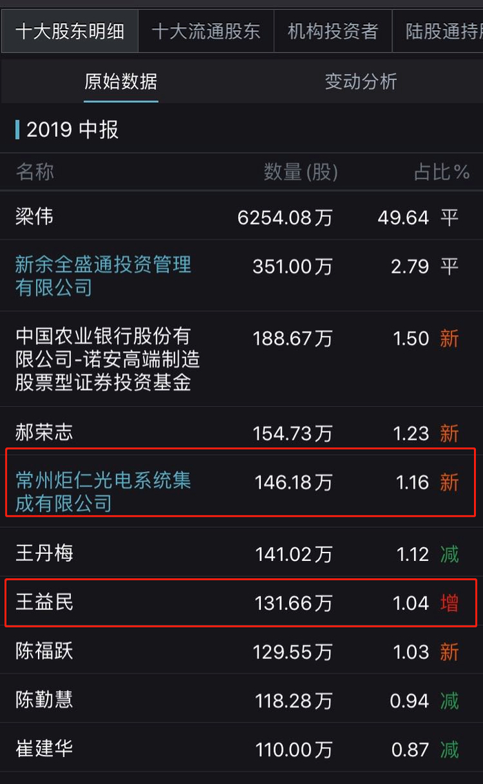 2019年中报显示,常州炬仁光电系统集成有限公司(简称“炬仁光电”)持股146.18万股,占总股本的1.16%,首次出现在十大股东名册中。