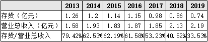 ▲2013-2019年公司存货及其占营业总收入比例