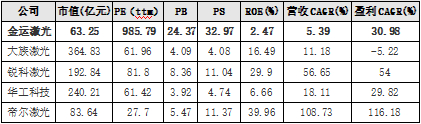 再来看看金运激光的估值情况,从PB(市净率)的角度看,大族激光、锐科激光、华工科技和帝尔激光的平均PB为5.46,而金运激光PB是可比公司平均水平的4.46倍。可见金运激光的估值严重虚高。