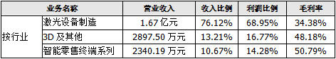 根据2019年年报,激光设备制造业务占其营业收入的76.12%,占其利润的68.95%,为公司核心业务。智能零售终端系列业务是公司开拓的新业务,于2019年刚开始贡献营收。