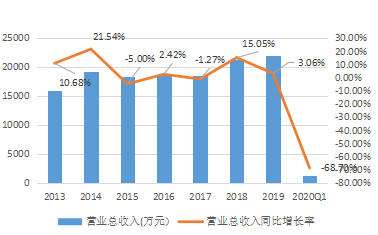 ▲2013-2020Q1金运激光营业总收入及其增速