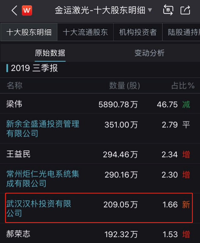 武汉汉朴投资有限公司(简称“汉朴投资”)于2019年三季度末,出现在金运激光的前十大股东中,持有1.67%股份。