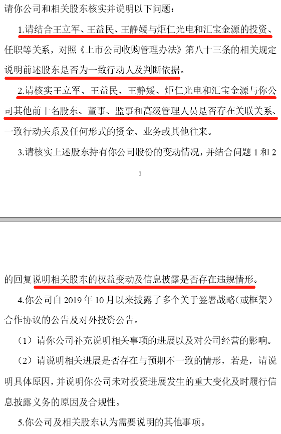 股东的书面回复未明确确认,其是否相互构成一致行动关系。金运激光则替其承认了一致行动关系:“如无相反证据,王立军、王益民、王静媛与炬仁光电、汇宝金源、海坤控股、太平通讯及太平集团互为一致行动人。”