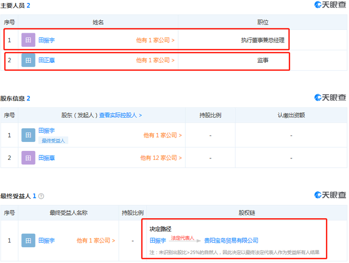 天眼查显示,另有一家贵阳宝岛贸易有限公司(经营状态显示:吊销,未注销),成立于1999年1月11日,田振宇任执行董事兼总经理,田振惠任监事。说明田振宇与田振惠关系紧密,甚至可能是近亲关系。