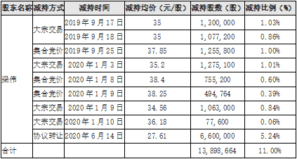 综合计算,于2018年12月14日至2020年6月14日期间,梁伟合计减持1489万股,占其持股的23.44%,减持均价为30.6元/股。