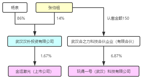 2019年8月29日,张伯祖及梁伟(金运激光实控人)等人发起成立合之力。2019年10月25日,合之力入股玩偶一号。