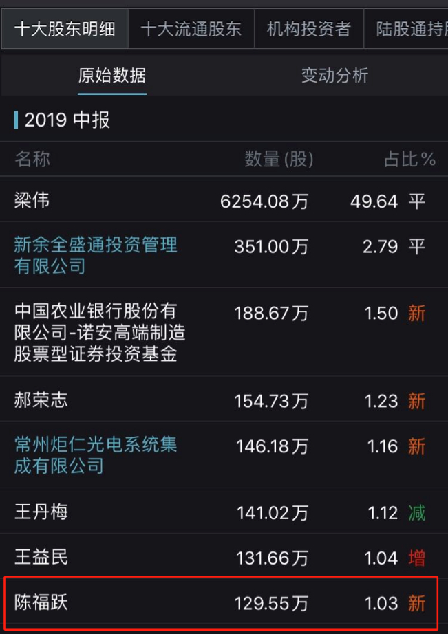 金运激光2019年中报显示,自然人陈福跃持股129.55万股,占总股本的1.03%,首次出现在前十大股东。