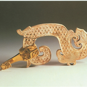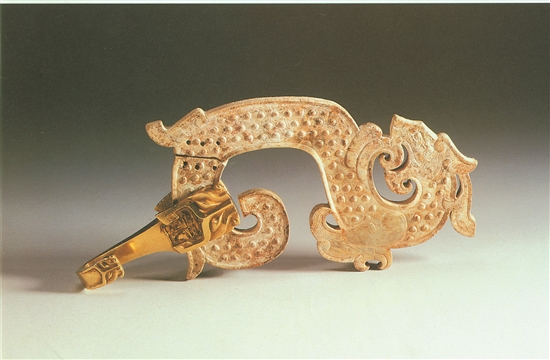 玉龙长体弯曲成S形,回首张口,衔住背鳍,尾巴回卷,下半端折断,断口两边各钻有3个小圆孔,应以线绳连缀。金带钩是铸成的,器表打磨光洁,钩尾和钩首都作虎头形。钩尾的虎头双眉上扬,额顶铸出一个汉字的“王”字,非常形象。虎口形成的套銎,刚好套住玉龙的折断处。钩腹有一圆钮,显然是龙形玉佩下半断裂后,特意制作了一虎头金钩与之相配,使玉佩改变功能成为带钩。