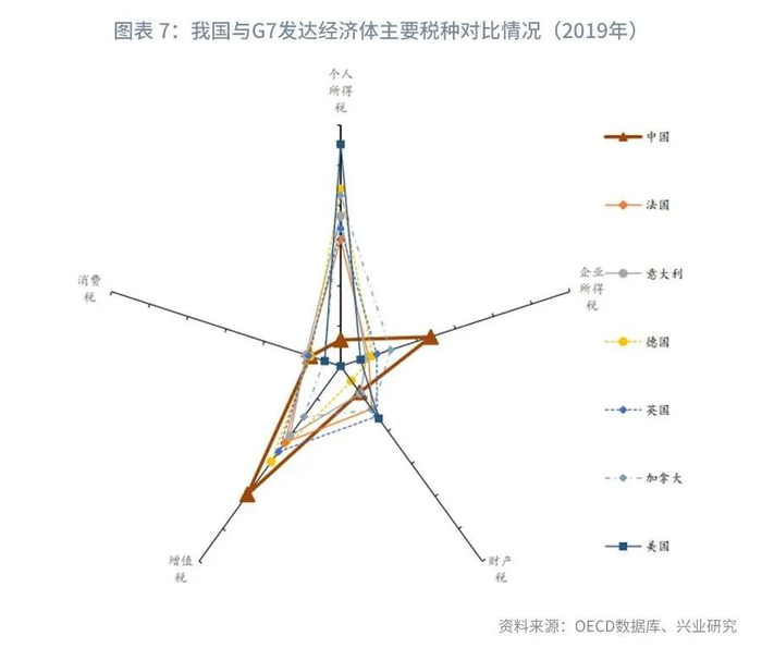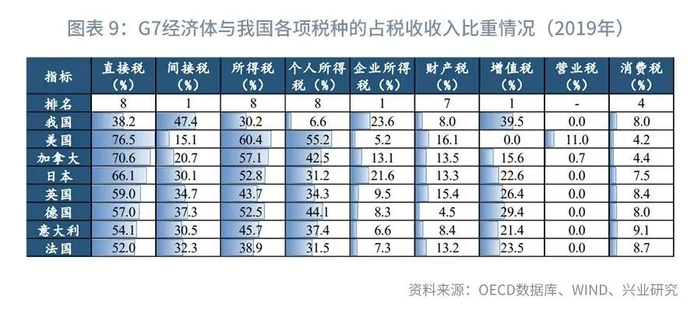 在税种结构分布方面,分别与G7发达经济体及部分新兴经济体进行对比,从2019年及2018年的数据来看,我国与其他经济体的主要差异在于: