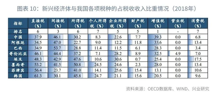 第二,在直接税方面,我国所得税占比偏低,且个人所得税与企业所得税比重结构差异较大。根据数据对比,我国个人所得税占税收收入比重远低于典型发达经济体,并低于多数新兴经济体;而企业所得税则远高于典型发达经济体,并与多数新兴经济体相近。
