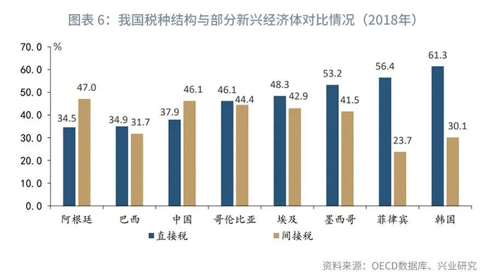 第一,直接税与间接税结构差异较大,我国直接税偏低,间接税偏高。从与新兴经济体对比情况来看,我国与阿根廷、巴西的直接税、间接税的总体结构相似,只是在具体税种上存在一定差异,但与哥伦比亚、埃及、墨西哥、韩国等新兴经济体比较,我国直接税比重依然较低。从与发达经济体对比情况来看,结构差异更为显著。2019年我国直接税比重分别约为38.2%,而发达经济体的直接税比重多在50%以上,如美国和加拿大的直接税比重达70%以上。我国间接税占比达47.4%,而美国、加拿大仅分别为15.1%和20.7%,其他发达经济体基本则在30%~35%之间。