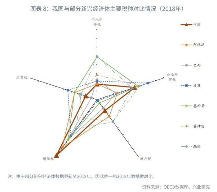 在税种结构的国际比较方面,我国直接税占比偏低,约为39.8%,间接税占比偏高,约为46.3%,而直接税的收入分配效应较大。直接税中,我国所得税占比偏低,且个人所得税与企业所得税比重结构差异较大,财产税比重相对偏低,2019年占比仅为8.0%,与新兴经济体相比处于中间水平。在间接税方面,我国增值税占税收收入比重为39.5%,显著高于发达经济体,在新兴经济体中也为最高水平;消费税占比为8.0%,与大部分发达经济体一致,与新兴经济体相比偏低。