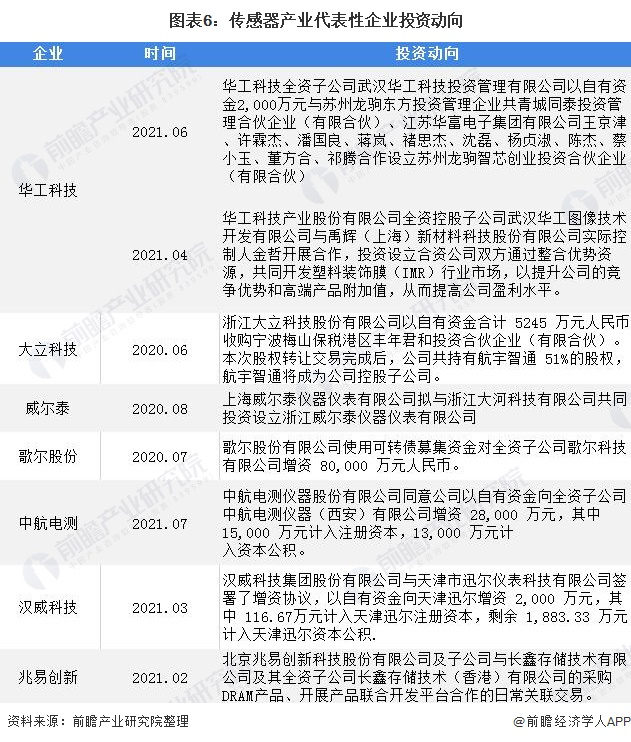 传感器产业代表性企业最新投资动向