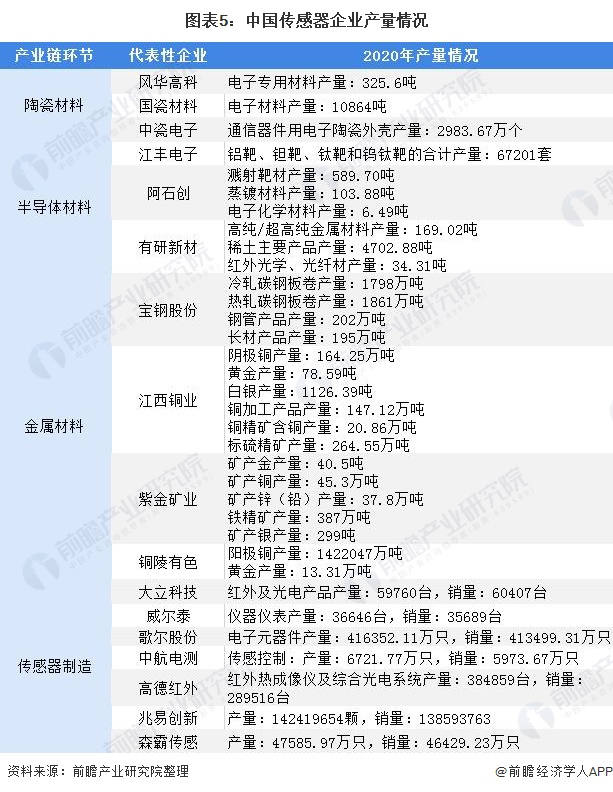 目前,在传感器制造行业歌尔股份、森霸传感、兆易创新等传感器产量处于领先位置。传感器产业产业链上的其他代表企业2020年产量情况如下: