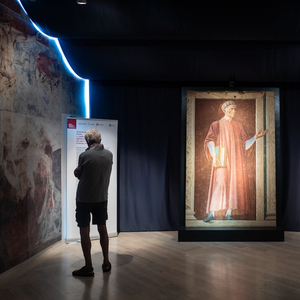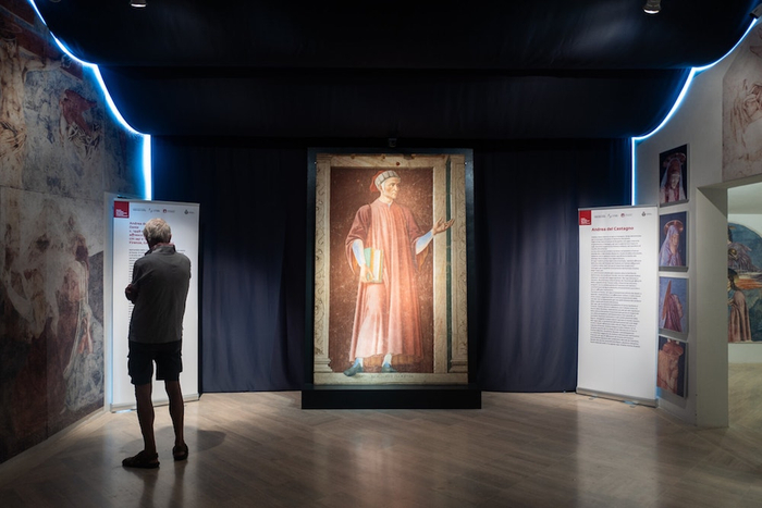 2021夏天,小村的文化旅游却骤然升温,因为乌菲齐美术馆将一张修复的卡斯塔尼奥湿壁画出借至此,画面的主人公则是大诗人但丁(1265-1321)。今年适逢但丁逝世700年,也是画家安德烈·德·卡斯塔尼奥诞辰600周年。乌菲齐美术馆(The Uffizi Gallery)是世界著名绘画艺术博物馆,以收藏欧洲文艺复兴时期和其他各画派代表人物如达·芬奇、米开朗基罗、拉斐尔、波提切利、丁托列托、伦勃朗、鲁本斯、凡·代克等作品而驰名,并藏有古希腊、罗马的雕塑作品。