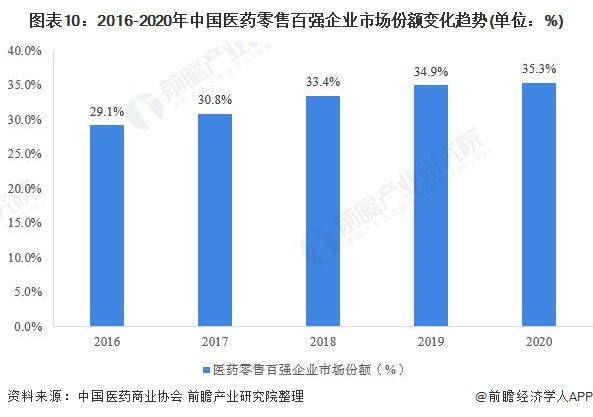在医药零售市场,随着我国医药改革的深入推进,我国医药零售领域药店连锁化发展趋势逐渐显现,众多单体药店或退出市场或被大型连锁药店企业并购,行业发展逐步规范,市场集中度持续提升,2016年以来,我国医药零售百强企业市场份额稳步增长,由2016年的29.1%提升至2020年的35.3%。