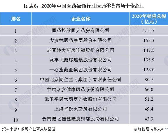 在医药零售市场,国药集团旗下国大药房凭借资源优势稳居第一;大参林、老百姓、益丰药房等上市企业借助资本市场快速发展,也名列前茅。2020年,前五家医药零售企业销售额均在100以上水平。