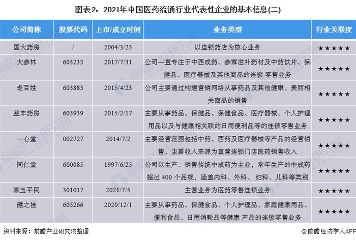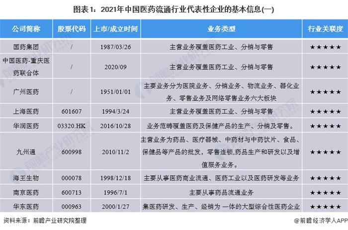 医药流通的一般渠道可分为两个环节,一是批发环节,二是零售环节。药品市场的流通渠道,也是由生产商通过批发商销售给零售商(包括医院药房)。以下为我国医药流通行业代表性企业的基本信息: