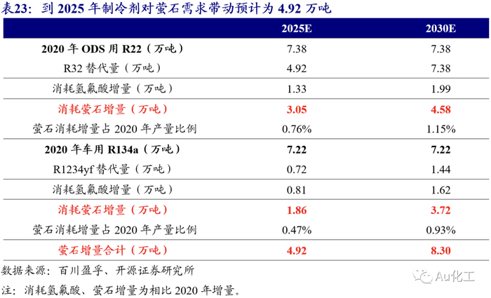 根据百川盈孚数据,2020年R22作为空调制冷剂、空调售后消费量分别为24597、49194吨;R134a作为汽车制冷剂消费量为72220吨。我们假设:(1)每代制冷剂之间同质量替代。(2)到2025年空调制冷剂用R22完全被R32替代,空调售后用R22的50%被R32替代;到2030年ODS用R22完全被R32替代。(3)汽车制冷剂R134a在2025年被R1234yf替代10%,2030年20%。(4)R22的氢氟酸单耗为0.53t/t,R32的氢氟酸单耗为0.8t/t;R134a的氢氟酸单耗为0.88t/t,R1234yf的氢氟酸单耗为2t/t。(5)氢氟酸的萤石单耗为2.3t/t。则根据以上假设可测算得到:制冷剂2025、2030年对萤石的带动分别为4.92、8.30万吨。