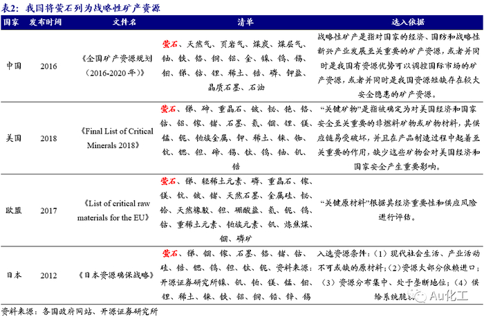 各国均高度注重萤石资源储备,我国将萤石列入战略性矿产目录。为加强资源保障和储备,从安全、经济发展、产业升级等角度出发,萤石被列入我国《24种战略性矿产目录》,其“不可再生”的稀缺性、“关系国计民生”的重要性价值凸显。国土资源部《全国矿产资源规划(2016-2020年)》指出:“为保障国家经济安全、国防安全和战略性新兴产业发展需求,将石油、天然气、煤炭、稀土、晶质石墨等24种矿产列入战略性矿产目录,将其作为矿产资源宏观调控和监督管理重点对象,并在资源配置、财政投入、重大项目、矿业用地等方面加强引导和差别化管理,提高资源安全供应能力和开发利用水平”。