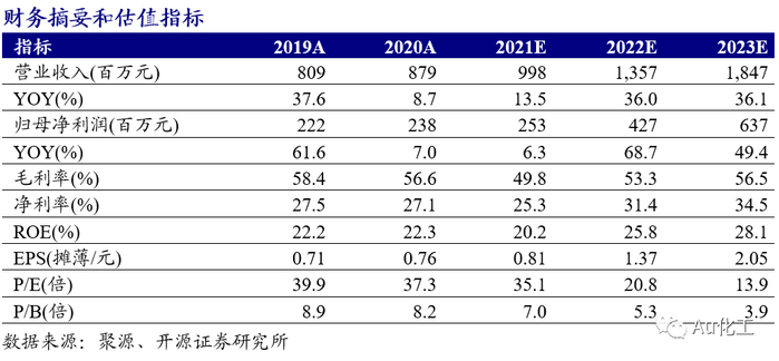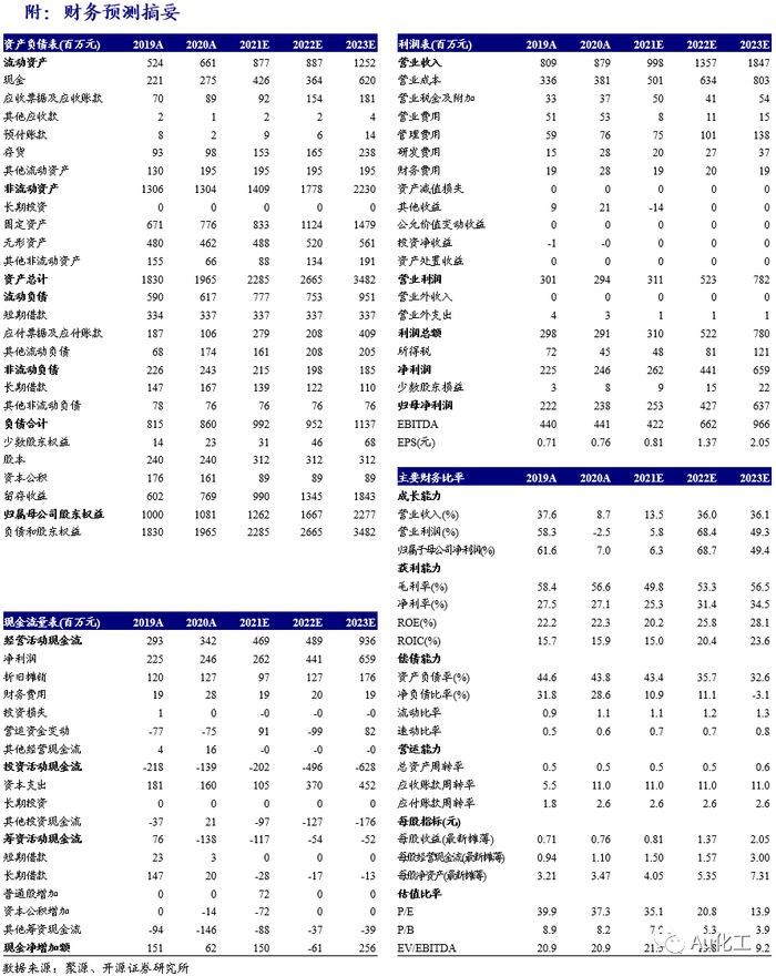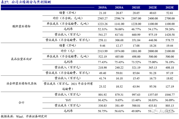 (3)冶金级萤石精粉及其他:将产销量较小的冶金级萤石精粉与其他业务合并来看,假设2021下半年收入与上半年相同,2022、2023有所增长。为方便计算,将会计准则变动下的运输费用全部计入这一模块,未来随萤石销量增长而同步提升。