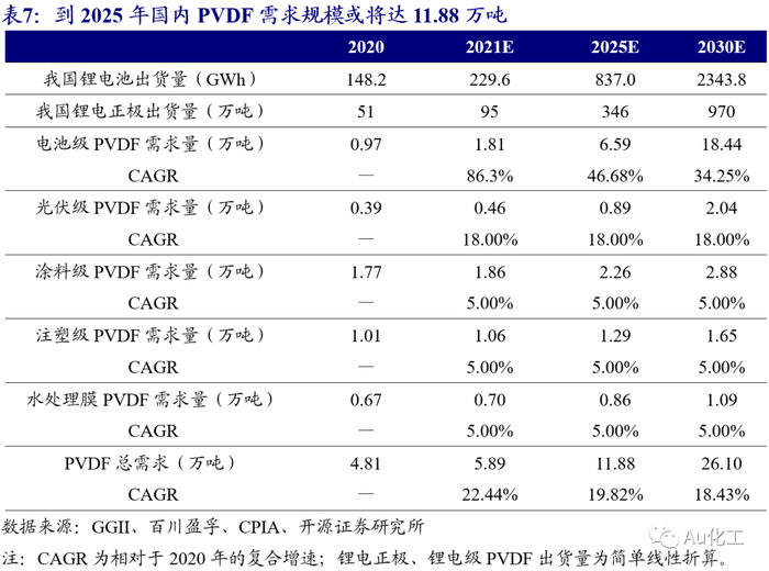 聚偏氟乙烯(PVDF)是一种半结晶性含氟聚合物,因为具有好的机械强度、化学稳定性、电化学稳定性、热稳定性和对电解液良好的亲和性,应用于锂电池、光伏、涂料、注塑、水处理膜等领域,是含氟塑料中产量第二位大产品。PVDF是锂离子电池正极粘结剂的重要组成部分,对电池的性能指标、安全性和良品率有决定性作用。据IIGG数据,2020年我国锂电正极材料出货量为51万吨,2021年上半年出货量为47.5万吨。我们假设我国锂电正极材料2021全年出货量为95万吨,未来增速与锂电池出货量增速相同。又据百川盈孚数据,2020年电池级PVDF消费量为0.97万吨,假设未来增速与锂电正极出货量增速相同。百川盈孚数据显示,2020年光伏级、涂料、注塑、水处理膜的PVDF消费量分别为0.39、1.77、1.01、0.67万吨。我们假设光伏级、涂料、注塑、水处理膜用PVDF年增速分别为18%、5%、5%、5%。测算得出,电池级PVDF的市场需求规模到2025、2030年将达5.77、12.52万吨;对PVDF的总需求到2025、2030年将达11.88、26.10万吨。