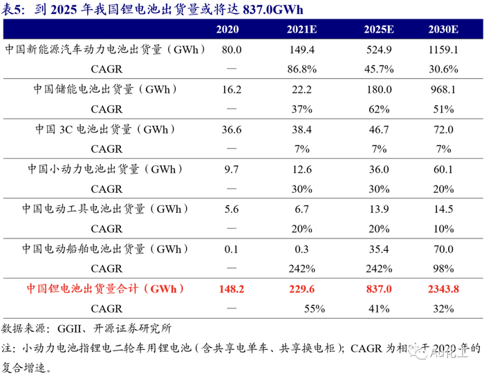 3C、两轮车、电动工具、电动船舶等将共同拉动储能电池的需求。3C电池:据GGII数据,2020年我国3C数码电池出货量为36.6GWh,同比增长8.8%。受线上办公、电子烟、智能可穿戴设备、5G技术推广等需求催化,3C电池需求将保持平稳,未来几年3C数码电池需求增速或将保持在5%-10%,我们假设7%。小动力电池:小动力电池主要指二轮车用锂电池(含共享电单车、共享换电柜),据GGII数据,受海内外锂电轻型车市场需求大幅增长影响,2020年锂电二轮车用锂电池出货量达9.7GWh,同比增长78%。未来几年随共享市场规模提升,以及《电动自行车安全技术规范》新的强制性国家标准的执行,新产两轮车锂电池应用占比提升,对铅酸电池替代加速,预计未来几年我国锂电轻型车用锂电池出货量增速在30%左右,替代高峰过后增速下降至20%左右。电动工具:据GGII数据,2020年国内电动工具用锂电池出货量为5.6GWh,同比增长124%。因TTI等主流电动工具厂商产业链向中国转移,叠加国内圆柱锂电池企业加速对LG、SDI和松下的替代,预计未来几年电动工具用锂电池需求复合增速在20%左右,在高峰过后增速下降至10%左右。电动船舶:电动船舶具有绿色环保以及成本较低等优点,其运行成本明显低于柴油和LNG(液化天然气)染料船舶。据《中国电动船舶行业发展白皮书(2021年)》数据显示,2020年我国电动船舶用锂离子电池出货量达75.6MWh,同比增长94.8%。GGII预计到2025年我国电动船舶渗透率18.5%,锂电池需求量将达35.41GWh;若到2030年渗透率翻倍,则锂电池需求量或达70GWh左右。综合来看,到2025、2030年,我国锂电池出货量或将达837.0、2343.8GWh。