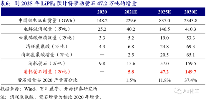六氟磷酸锂(LiPF6)是制造锂离子电池电解质的主要原料,由于其具有良好的离子导电率和电化学稳定性,是目前最常用的电解质锂盐,主要用于锂离子储能电池及其它日用电池,开发利用前景广阔。目前,工业上生产LiPF6的主要方法是氟化氢溶剂法。氟化氢溶剂法是将卤化锂溶解在无水氟化氢中,再通入高纯PF5气体进行反应,生产LiPF6晶体,再经过分离、干燥得到LiPF6产品。该反应在液相中进行,反应均匀且容易控制,便于实现连续化生产,反应速度快且转化率高。据GGII数据,2020年我国电解液市场出货量25.2万吨,2021上半年出货量为20.1万吨。我们假设2021年全年出货量为40.2万吨,未来增速与锂电池出货量增速相同。目前,LiPF6占锂电池电解液的质量比例约为13%。根据多氟多、滨化股份、青海聚之源、九九久科技等公司环评报告,以及百川盈孚数据,我们假设LiPF6对氢氟酸的单耗为1.3t/t,氢氟酸对萤石的单耗为2.3t/t。测算得出:到2025、2030年,LiPF6可拉动萤石需求增量约47.2、149.7万吨。