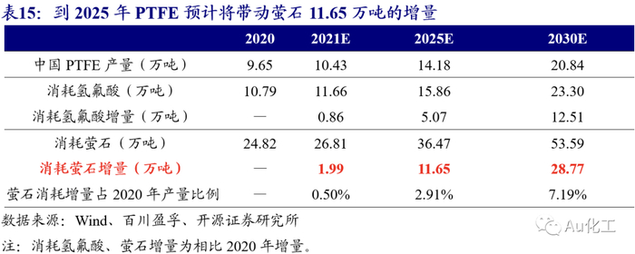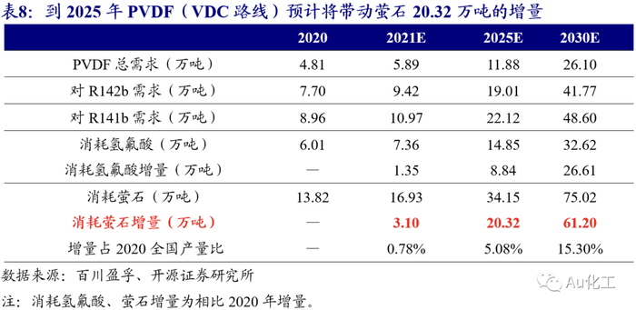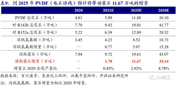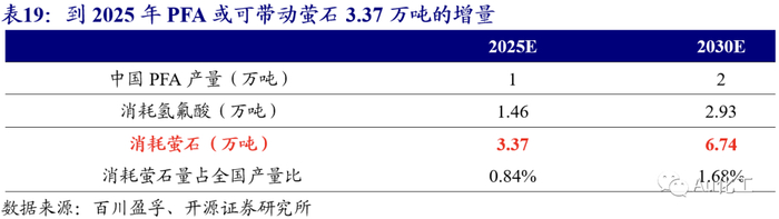 PFA:市场规模不断扩大,国内企业有望打破国外垄断。全氟烷氧基树脂(PFA)是四氟乙烯(TFE)与全氟丙基乙烯醚(PPVE)的共聚物。它拥有优良的化学稳定性、物理机械性、电绝缘性、润滑性、不黏性、耐老化性、不燃性和热稳定性。PFA最大的优点是可熔融加工,且在高温下的机械强度是PTFE的2倍左右。据新思界产业研究中心数据,PFA在化学工业、电子电气设备、精密设备等领域广泛应用,随着下游产业的发展,PFA市场需求快速攀升,市场规模不断扩大,预计到2024年底我国PFA市场规模将达到11.9亿美元。目前跨国企业几乎垄断全球PFA市场,我国PFA产品也主要依靠进口。由于PFA发展潜力较大,国内公司也已实现技术突破,纷纷布局PFA产品。巨化股份(在建3000吨)、东岳集团(在建2000吨)、昊华科技(在建500吨)为国内先行者。因为PFA应用前景可观且各厂商已开始产能建设,我们假设,到2025年PFA产量可增加1万吨,2030年增加2万吨。根据巨圣氟化学环评、百川盈孚数据,假设PFA的氢氟酸单耗为1.46t/t,氢氟酸的萤石单耗为2.3t/t。测算得出,PFA的增长到2025、2030年将带动萤石3.37、6.74万吨的需求增量。