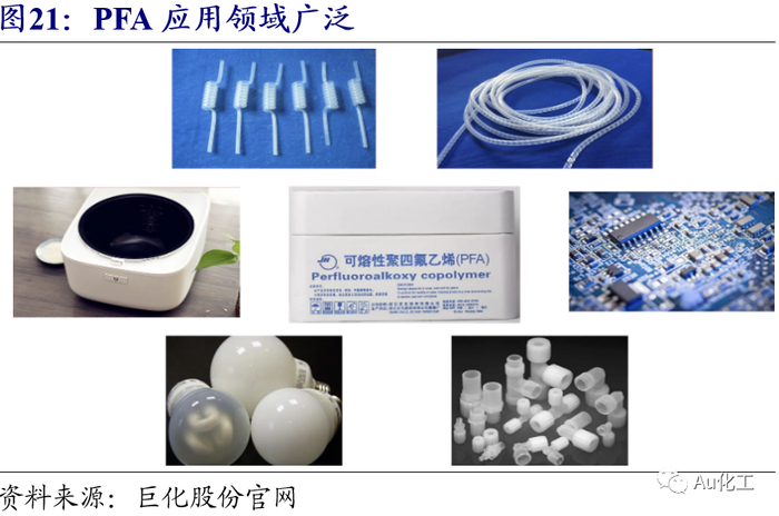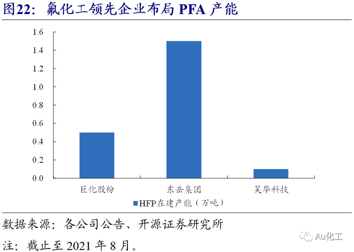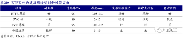 ECTFE:性能良好,未来拓展空间大。乙烯-三氟氯乙烯共聚物(ECTFE)是三氟氯乙烯和乙烯的交替共聚物,既保留了聚三氟氯乙烯均聚物原来的优良性能,如耐热、耐化学性及耐候性,又极大地改善了热塑性加工性能。ECTFE具有优良的耐腐蚀性能、极低的渗透率和优良的电性能,且表面极端光滑,适宜制造安全使用的产品,被允许使用于食品和饮用水领域。此外,ECTFE还是一种具备相当机械强度的坚韧材料。由于其自身独特性能,ECTFE目前已被用于制备高性能微孔膜、氯碳粉末涂料、电缆、内衬、涂层以及光伏组件薄膜等领域,有着其他树脂无法替代的特点,产品应用价值高。根据新思界产业研究中心数据,目前全球只有苏威一家公司在生产ECTFE,国内只有大连振邦氟涂料有限公司有ECTFE中试装置筹建的报道,但未见规模化生产产品。虽然ECTFE未来拓展空间大,但国内企业规划预期不明,所以暂不做测算。