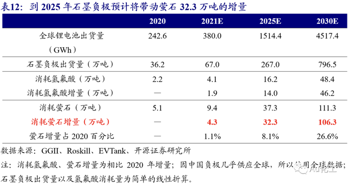 石墨(天然石墨)是一种非金属矿产资源,其制成的材料具备耐高温、导电、导热、化学稳定、抗热震、润滑等多种特殊性能。其中球形石墨属于石墨中的高端产品,应用于新能源汽车、储能、环保等战略性新兴产业领域。球形石墨材料具有良好的导电性、成本低、理论嵌锂容量高、充放电电位低且平坦等特点,是作为锂离子电池负极材料的重要部分。在球形石墨生产环节中,目前大多利用氢氟酸与石墨中的杂质反应生成溶于水的氟化物及挥发物从而达到提纯的目的。随着新能源汽车、储能等新兴产业的快速发展,将带动锂电池,进而带动石墨负极和氢氟酸的需求量。据GGII和Roskill数据显示,2020年我国负极材料出货量达36.5GWh,几乎全部使用球形石墨材料,其中约80%(约29GWh)使用氢氟酸提纯技术,共消耗氢氟酸约2.2万吨。目前,全球球形石墨基本都由中国供应,所以我国球形石墨负极出货量受全球市场影响。据TrendForce和EVTank数据:2020年全球新能源汽车销量为331.1万辆,汽车动力电池需求量为158.2GWh;2021年全球新能源汽车销量预计增长49%,动力电池需求量预计为270.5GWh;到2025和2030年,全球新能源汽车销量预计为1800和4000万辆,动力电池需求量或将达1059和2661GWh。又据GGII数据,2021年上半年全球/中国储能电池出货量达18.2/11.1GWh,假设全年为36.4/22.2GWh,且假设未来中国出货量占比保持不变。又结合ESCN以及前文测算数据,我们预计2025、2030年全球锂电出货量将达1514.4、4517.4GWh。又据GGII数据,2021年上半年我国负极材料出货量为33.5万吨,则我们假设2021全年出货量可达67万吨,未来将随锂电池需求增速增长,对氢氟酸的需求量也将随球形石墨需求的增加而同步增长。测算得出,作为球形石墨提纯用氢氟酸到2025、2030年对萤石需求拉动将达32.3、106.3万吨。