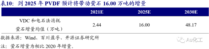 对以上两种制造PVDF工艺消耗的萤石量取均值,得到PVDF在2025、2030年对萤石需求的拉动为16.00、48.17万吨。