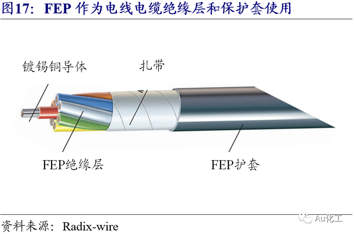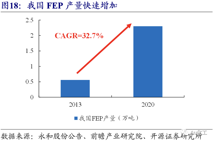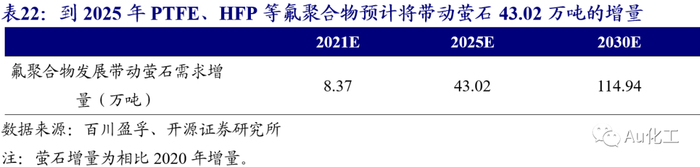 FEP:随着我国生产技术日益成熟,国产FEP市场份额占比不断提高。聚全氟乙丙烯(FEP)是四氟乙烯(TFE)和六氟丙烯(HFP)的结晶聚合物,其中HFP含量约18%左右,是聚四氟乙烯(PTFE)的改性品种之一。FEP性能与PTFE相似,但与PTFE不同的是,FEP的熔融粘度比PTFE低百万倍,弥补了PTFE加工困难的不足,适用于氟塑料所能应用的各个领域,使其成为在部分领域代替PTFE的材料,在电线电缆生产中广泛应用于高温高频下使用的电子设备传输电线、电子计算机内部的连接线、航空航天用电线及其特种用途安装线、油泵电缆和潜油电机绕组线的绝缘层。起初我国FEP主要依靠进口,随着我国FEP生产技术日益成熟,国产FEP产品市场份额不断提高。在发达国家建筑物的信息传输电线电缆中,FEP电缆的使用率已经超过70%。随着其在发展中国家的快速普及,该部分市场容量将快速增长。据永和股份招股说明书和前瞻产业研究院数据,我国FEP产量由2013年的0.56万吨增长至2020年的2.3万吨,复合增速32.7%。因FEP未来有较大的发展空间,预计其需求将保持高增速,假设为20%。又根据江西理文环评和百川盈孚数据,FEP的氢氟酸单耗约为1.06t/t,为避免重复计算,若单耗不考虑HFP,则单耗约为0.83t/t。氢氟酸的萤石单耗为2.3t/t。测算得出,FEP的增长到2025、2030年将带动萤石6.50、22.66万吨的需求增量(不考虑原料HFP)。