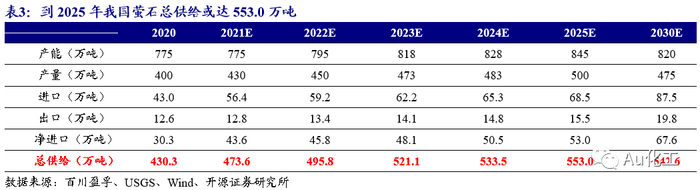 我们可以得到未来5年总供给分布(产量+净进口),到2025年我国萤石总供给量或将达553.0万吨。