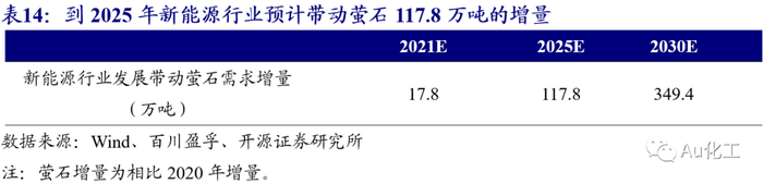 根据以上测算,预计新能源行业到2025、2030年拉动萤石需求增量约为117.8、349.4万吨。