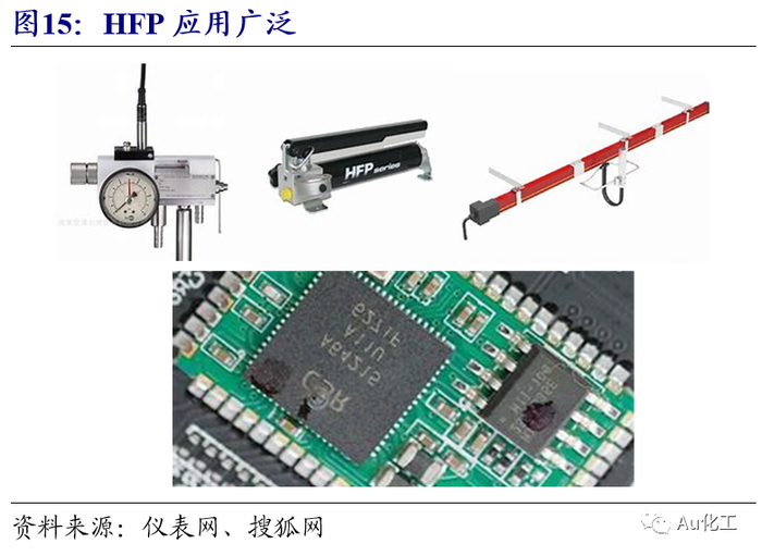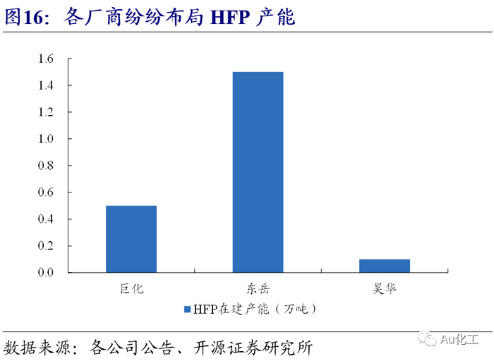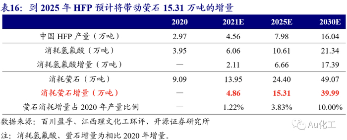 HFP:用途广泛,是多种氟产品的原料,我国生产规模不断扩大。六氟丙烯(HFP)是有机氟工业中及其重要的全氟中间体,主要用于生产氟橡胶、氟塑料等含氟材料和含氟精细化学品。作为共聚物单体,HFP与偏氟乙烯、四氟乙烯等按一定比例共聚可制得具有超高耐热、超低流组、耐腐蚀、耐溶剂性的氟橡胶;与四氟乙烯按一定比例共聚,可制得具有良好的耐高低温、耐腐蚀、绝缘性高且易加工的氟塑料,这种氟塑料被广泛应用于航天航空、电子工业等领域。随着计算机行业的突飞猛进,其使用量快速扩大。HFP作为有机中间体,可与次氯酸盐或双氧水反应,制成HFPO作为全氟醚、可熔性聚四氟乙烯等的主要原料。HFP经氟化反应可得到R227,是一种灭火效果很好的新型灭火器。此外,HFP也是各种氟系表面活性剂和含氟精细化工产品的原料,广泛应用于微电子、光电等高新技术领域。作为氟化工发展的三大基本原料之一,HFP的需求不断增加。据百川盈孚数据,2020年我国HFP产量为2.97万吨,2021年上半年产量为2.28万吨,HFP迅速放量。我们假设,2021年我国HFP产量为4.56万吨,未来每年增速15%。根据江西理文化工环评等资料,可假设HFP氢氟酸单耗为1.33t/t,氢氟酸的萤石单耗为2.3t/t。测算得出,HFP的增长到2025、2030年将带动萤石15.31、39.99万吨的需求增量。