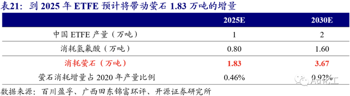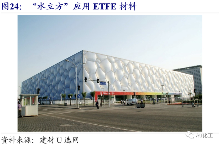 ETFE:性能优异,需求不断增加,国内企业开始产业化布局。乙烯-四氟乙烯共聚物(ETFE)是乙烯(E)与四氟乙烯(TFE)是交替共聚合成的氟树脂。ETFE不仅具有PTFE的耐热、耐化学性、电绝缘性,而且其密度、耐辐射和机械性能有了很大程度的改善,被称为最强韧的氟塑料。ETFE主要用于农业温室的覆盖材料以及各种建筑物的棚膜材料,是继PVC膜材和PTFE膜材之后用于建筑结构的第三大类产品,透光率可高达95%且有一定的自洁能力,号称“软玻璃”。英国伊甸园、2008年北京奥运会国家游泳中心(水立方)等场馆都采用了这种膜材料。ETFE凭借良好的性能平衡和突出的力学性能,使其成为消费量位列第四的氟树脂。目前,国际上大规模生产ETFE的厂商主要有美国DuPont和3M公司、日本Asahi和Daikin公司。我国从20世纪80年代开始进行ETFE的探索性研究,虽然我国目前仍没有大规模生产ETFE,但部分公司因看好ETFE未来发展前景,已开始规划建设。如巨化股份的3000万吨ETFE产能已经开建,预计2024年投产。我们假设到2025、2030年我国ETFE产量分别为1万吨和2万吨。据广西田东锦富环评和百川盈孚数据,ETFE的氢氟酸单耗为0.80t/t,氢氟酸的萤石单耗为2.3t/t。测算得出,ETFE到2025、2030年将带动萤石1.83、3.67万吨的需求增量。