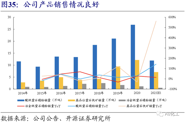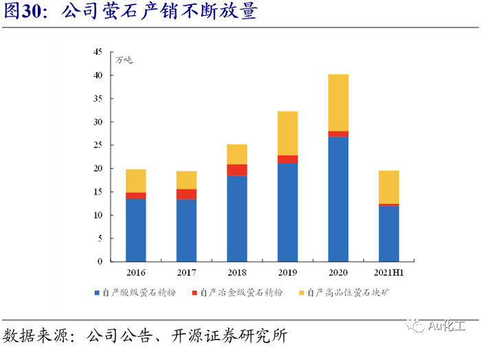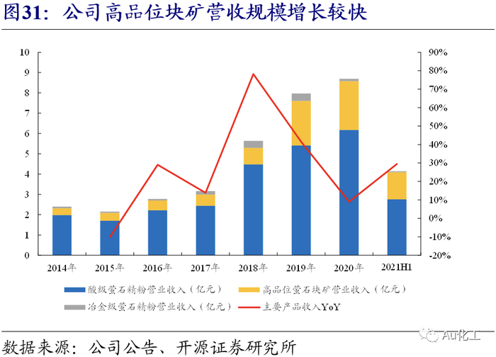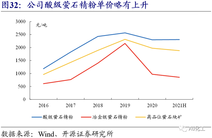 公司产品结构有所优化。公司酸级萤石精粉和高品位萤石块矿产销量保持高速增长。2020年,公司酸级萤石精粉和高品位萤石块矿产量分别为26.81万和13.40万吨,同比增长25.0%和7.5%;销量分别为26.87万吨和12.17万吨,同比增长27.3%和28.6%。2021H1公司酸级萤石精粉产销量分别为11.99、11.93万吨,同比增长21.11%、13.94%;高品位萤石矿块产销量分别为6.76、7.11万吨,同比41.72%、142.66%。采用预处理技术后,公司可以投入使用低品位萤石原矿并产生经济效益。随着兰溪金昌2020年下半年投产,以及公司大力开拓北方市场,翔振矿业高品位萤石块矿销售同比增长,公司高品位萤石块矿产销不断提升。据公司2020年年报披露,公司2021年目标生产各类萤石产品约45万吨,同比约增长8.22%。