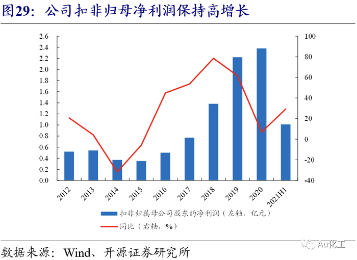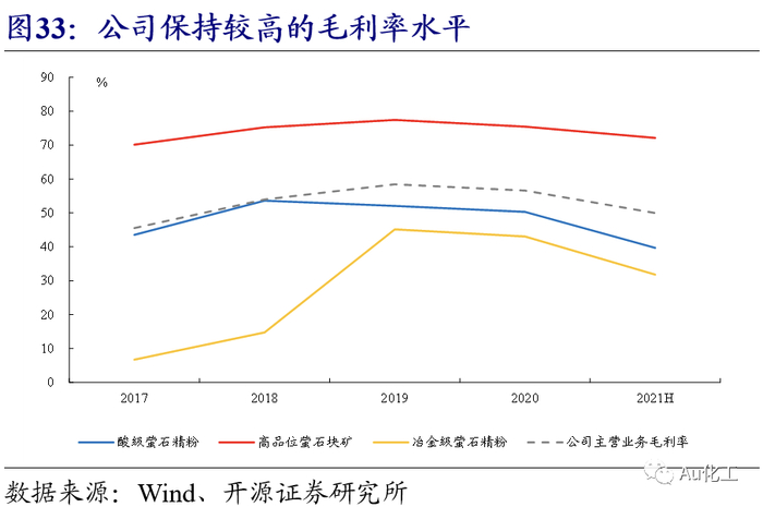 公司主要产品为酸级萤石精粉和高品位萤石块矿,业绩稳步增长。2016年到2020年,萤石行业落后产能陆续淘汰出清,行业整体景气度提升,尽管受疫情影响下游需求疲弱,但公司通过创新打破困局保证业绩稳步增长。2020年公司营收和归母净利润分别为8.79、2.38亿元,同比增长8.71%、6.97%。公司经营发展稳健,业绩稳步增长。2021H1实现营收4.17亿元,同比增长28.69%;实现扣非归母净利润1.01亿元,同比增长29.32%。2021H1公司酸级萤石精粉均价2,307元/吨(不含税,下同),同比下降113元/吨;高品位萤石块矿均价1,881元/吨,同比下降386元/吨,主要系翔振矿业高品位萤石块矿销售占比提高,而北方区域销售单价较低所至。公司长期保持较高毛利率,2020年公司酸级萤石精粉、高品位萤石块矿以及冶金级萤石精粉的毛利率高达50.34%、75.43%和43.06%。受产品平均售价下降以及将运输费用调整至营业成本影响,公司2021H1毛利率下降4.34 pcts至49.96%。