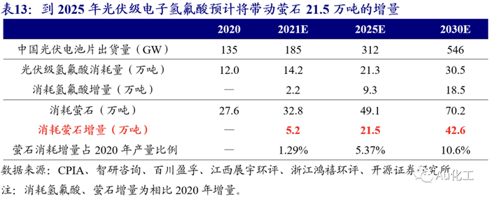 电子级氢氟酸作为氟精细化学品的一种,腐蚀性强,主要用于去除氧化物,是半导体制作过程中应用最多的电子化学品之一,广泛应用于集成电路、太阳能光伏和液晶显示屏等领域。光伏级电子氢氟酸主要应用于太阳能电池片的制绒和清洗等工艺工程。随着光伏行业的迅速发展,对光伏级电子氢氟酸的需求也不断增加。据中国光伏协会(CPIA)、百川盈孚数据:2020年我国光伏电池片产量为134.8GWh,消耗氢氟酸约12万吨;2021上半年光伏电池片产量92.4GWh,我们假设2021全年产量为184.8GWh;全球光伏新增装机预计将从2020年的130GW增长到2025年的330GW,我们假设电池片产量也同步增长,到2025年为342.7GWh,到2030年假设增速有所放缓。又据江西展宇、浙江鸿禧环评环评报告,1GWh电池片氢氟酸用量约450t。最后测算得出,作为制绒和清洗用途的光伏级电子氢氟酸到2025、2030年对萤石需求拉动预计将达21.5、42.6万吨。