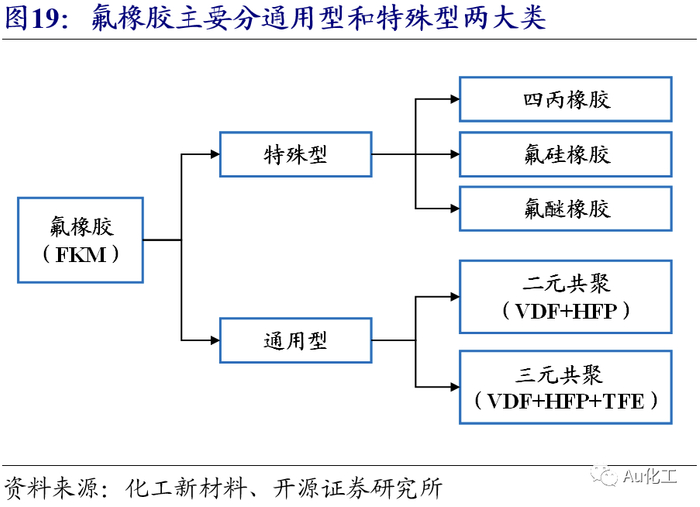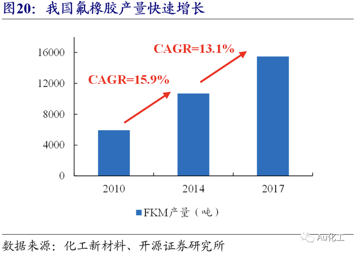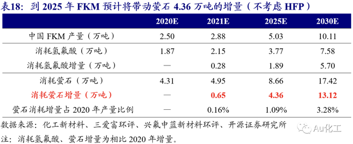 FKM:技术性能优异,需求将进一步扩大。氟橡胶(FKM)以VDF(偏氟乙烯)为主要成分,与HEP(六氟乙烯)共聚,或进一步再与TFE(四氟乙烯)反应而成。FKM具有出色的耐高温性能、高化学稳定性、耐候性、抗氧化性、耐油性以及很低的透气性。在军事工业上,FKM主要用于航天、航空及运载火箭、卫星、战斗机、新型坦克的密封件、油管和电气线路护套等方面,是国防尖端工业中无法替代的关键材料。目前FKM的类型主要有通用型和特殊型两种,通用型包括二元共聚物和三元共聚物;特殊型包括四丙橡胶等。随着氟橡胶的优异特性被逐渐认识,新的应用领域不断被开发出来,氟橡胶的需求量迅速增加。根据国化新材料研究院、化工新材料数据,2020年,国内汽车工业对氟橡胶的需求量将达到1.75万吨左右,加上其他领域的消耗,约有2.5万吨的市场规模。随着中国汽车工业、航空航天、石油化工、军事等工业需求的不断增长,氟橡胶的需求量将进一步扩大。我们假设FKM未来需求复合增速为15%。又据三爱富和兴氟中蓝新材料环评数据,我们假设FKM的氢氟酸单耗平均为1.13t/t,为避免重复计算,若单耗不考虑HFP,则单耗约为0.75t/t。氢氟酸的萤石单耗为2.3t/t。测算得出,FKM的增长到2025、2030年将带动萤石4.36、13.12万吨的需求增量(不考虑原料HFP)。