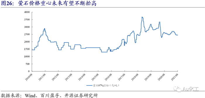 (2)国内产量:未来比较大的产能投放主要有金石资源的包钢萤石综合利用项目,预计2025年之前产量达到80万吨/年,则我们假设公司2022-2025每年新增产量20万吨。另外贵州磷化集团规划3年内氢氟酸产能增加6万吨,并且目前有技改项目或将增加氢氟酸产能2万吨,则我们假设其2022-2023年每年投产4万吨氢氟酸,萤石当量约9万吨。云南氟磷电子科技有限公司一期项目预计2022年9月投产2万吨氢氟酸,萤石当量约4.5万吨,三期2×1.5万吨无水氢氟酸假设2025年投产,折合萤石当量约6.8万吨。