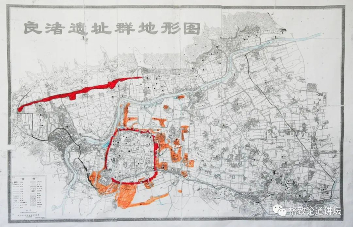良渚遗址的经济社会和城市建设非常发达。下图中,上面红色的线是山边的一个拦水坝,下边红的圆圈是它的城墙,黄的是周边发现的遗址。