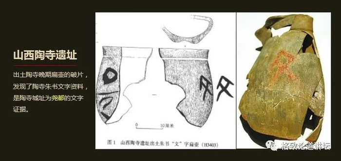"出土的这个陶寺晚期扁壶破片上,发现了陶寺朱书文字资料,是陶寺城址为尧都的文字证据。"