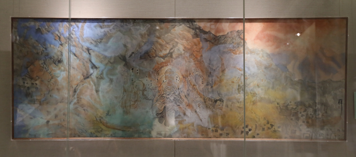 这三种表现方式,周建朋也同时运用到了丝绸之路其他点上。《朝圣敦煌》是纯粹的水墨,周建朋选择了一种布本,用布的材料来表现朝圣的心情,非常纯净。在画龙门石窟时,周建朋在墨底上做了改变,他从新疆收集了一些颜料、土,大胆地用朱砂、赭石来表现石窟的质感。敦煌附近的锁阳城、悬泉置遗址、天水的麦积山石窟……周建朋的创作一直在随地域的变化而做调整。