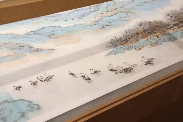 在《五星出东方利中国图卷》展柜的旁边,陈列了一幅《楠溪江图卷》。周建朋出生于浙江永嘉,永嘉县境内的楠溪江以其纯净奇异的美景和悠久深厚的人文精神滋养了这片土地的人。与新疆的美学截然不同,江南的品格是温润的,也有奇有秀。用青绿山水来作画楠溪江对周建朋来说是驾轻就熟,他自楠溪江九丈甸园沿江逆流而上,临江写生完成了这组画稿,《楠溪江图卷》中既有笔墨意趣,又有区别于传统山水画的写生味道。