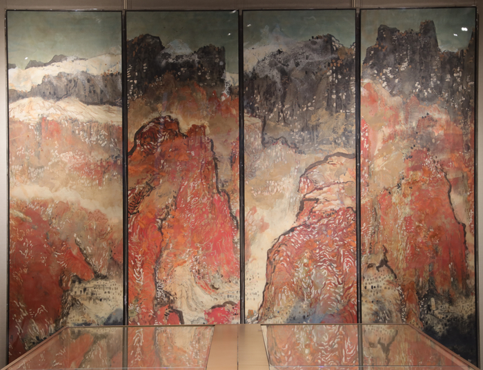 在此次展览的中心位置,是周建朋创作的《克孜尔印象》(创作时间:2011·2018年)。这幅作品大面积采用了清一色的红,这种用色方式在古代少有。周建朋说:“古人要么是青绿山水,要么是水墨山水,这与我们原来在内地所能看到的山川有关,很少有这种通红色数百公里的大山。我到了新疆库车后才体会到这种纯粹的美,但这种纯粹也给我带来了创作上的痛苦,新疆的天空很蓝,蓝天和红色山脉产生了强烈的对比美,但事实上在绘画里,红与蓝太强烈会非常俗气。”
