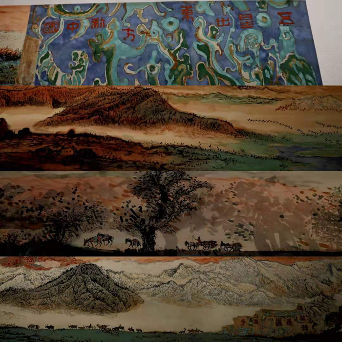 镜头化作笔墨,周建朋将上述的遐想画了下来。他用了6年时间,创作了长达26米的青绿山水长卷《五星出东方利中国图卷》。作品表现出大美新疆的自然风光和民族风情,同时用几段汉唐织锦图案表现祥瑞,把不同历史时空的元素组合在一个画面中。画卷最后画五星会聚天文奇观,预示盛事的到来。
