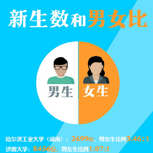 对于萌新们普遍关注的男女生比例,每所学校的情况大不相同。其中,哈尔滨工业大学(威海)的男女比例最大,为3.46:1。山东师范大学打破了惯有的男女比3:7,来到了1:2的新时代。